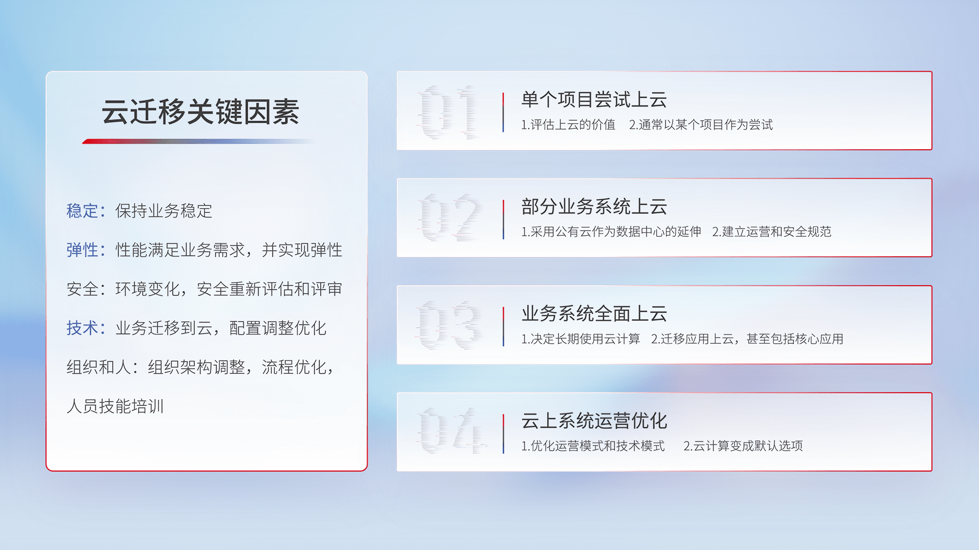 结合实际业务,,从规划设计、、云平台选型、、云原生改造、、、、数据迁移、、、集成交付,,迁移全过程为客户识别最佳上云路径,,,,做好风险识别管理,,,,设计网络架构、、身份权限、、、安全审计合规、、操作审计、、、日志审计、、、、监控告警策略、、、多站点容灾设计等,,,,对云上基础设施进行整体规划,,,,提升IT治理水平,,,以满足弹性、、高可用、、高性能的需求。。。
